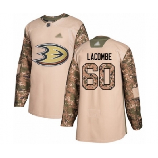 >Men's Anaheim Ducks #60 Jackson Lacombe Authentic Camo Veterans Day Practice Hockey Jersey