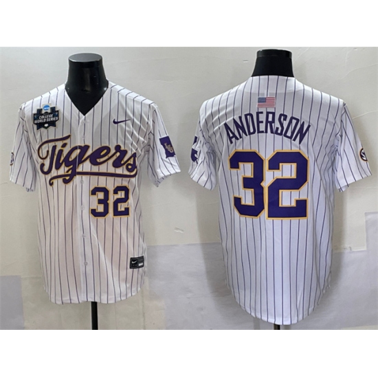 >Men's LSU Tigers #32 Kade Anderson White Pinstripe 2025 World Series & SEC Patch Stitched Baseball Jersey