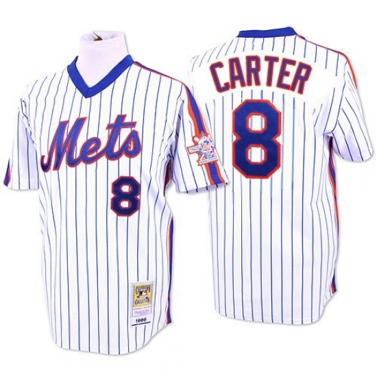 Home>MLB>New York Mets>Gary Carter>Men's Mitchell and Ness New York Mets #8 Gary Carter Replica White/Blue Strip Throwback MLB Jersey