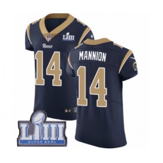 >Men's Nike Los Angeles Rams #14 Sean Mannion Navy Blue Team Color Vapor Untouchable Elite Player Super Bowl LIII Bound NFL Jersey