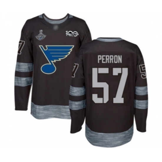 >Men's St. Louis Blues #57 David Perron Authentic Black 1917-2017 100th Anniversary 2019 Stanley Cup Champions Hockey Jersey