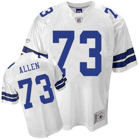 The Reebok Dallas Cowboys #73 Larry Allen White Legend Throwback Replica NFL Jersey by Reebok® is made with quick-drying nylon mesh and designed with screen-printed player and team graphics on the chest, back, sleeves and shoulders. 100% polyester diamond back mesh body, Polyester dazzle sleeves and yoke, Player's number screen-printed on the chest, back and sleeves, Player's name screen-printed at the upper back on a sewn down nameplate, Flat-knit collar with NFL® Equipment patch sewn at the point in the front, Woven jock tag shown at lower left front above the hem, Decorated in the team colors, Officially licensed .