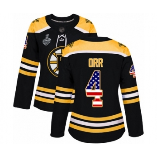 Women's Boston Bruins #4 Bobby Orr Authentic Black USA Flag Fashion 2019 Stanley Cup Final Bound Hockey Jersey