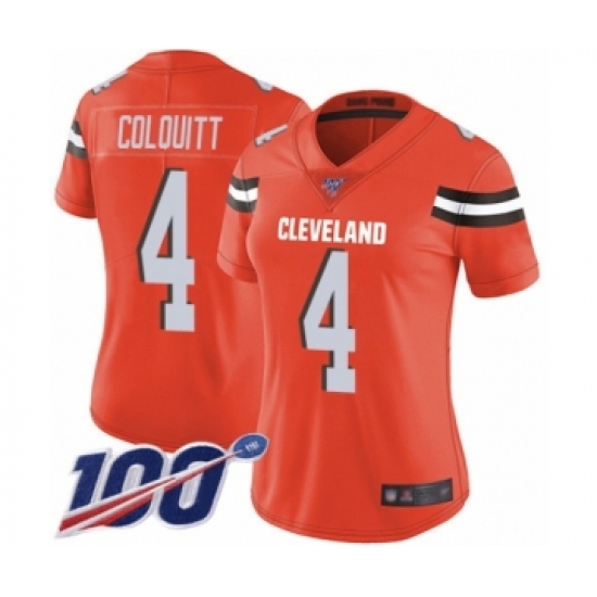 >Women's Cleveland Browns #4 Britton Colquitt Orange Alternate Vapor Untouchable Limited Player 100th Season Football Jersey