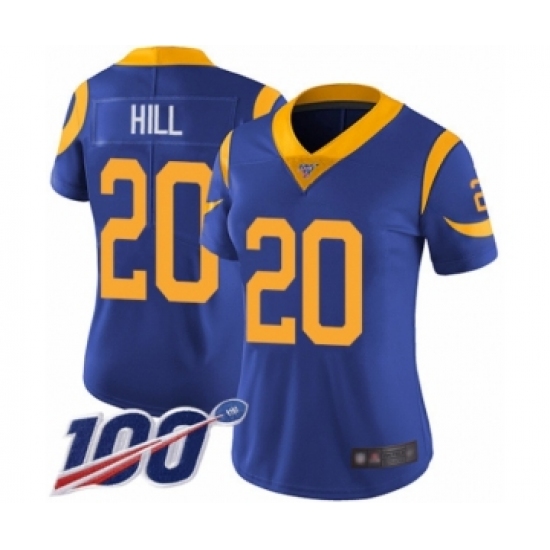 >Women's Los Angeles Rams #20 Troy Hill Royal Blue Alternate Vapor Untouchable Limited Player 100th Season Football Jersey