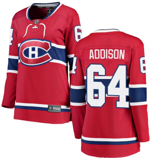 Home>NHL>Montreal Canadiens>Jeremiah Addison>Women's Montreal Canadiens #64 Jeremiah Addison Authentic Red Home Fanatics Branded Breakaway NHL Jersey