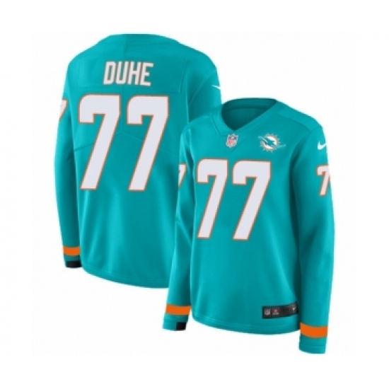 >Women's Nike Miami Dolphins #77 Adam Joseph Duhe Limited Aqua Therma Long Sleeve NFL Jersey