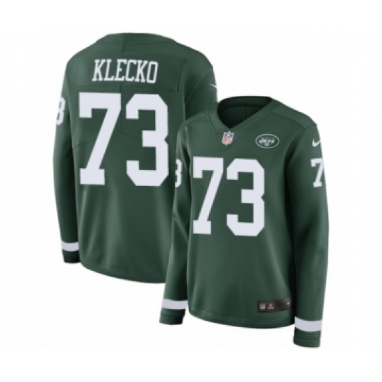 >Women's Nike New York Jets #73 Joe Klecko Limited Green Therma Long Sleeve NFL Jersey