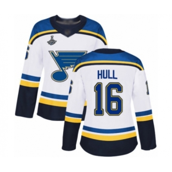 Women's St. Louis Blues #16 Brett Hull Authentic White Away 2019 Stanley Cup Champions Hockey Jersey