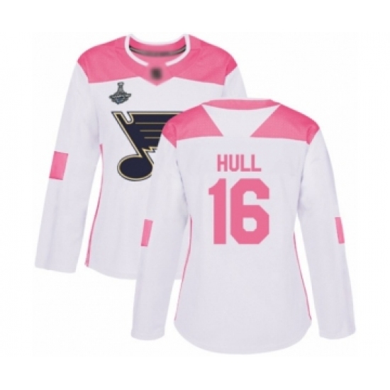Women's St. Louis Blues #16 Brett Hull Authentic White Pink Fashion 2019 Stanley Cup Champions Hockey Jersey