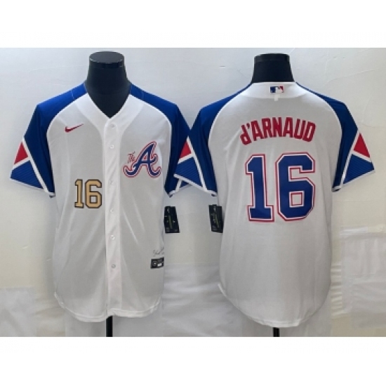 >Men's Atlanta Braves #16 Travis dArnaud Number White 2023 City Connect Cool Base Stitched Jerseys