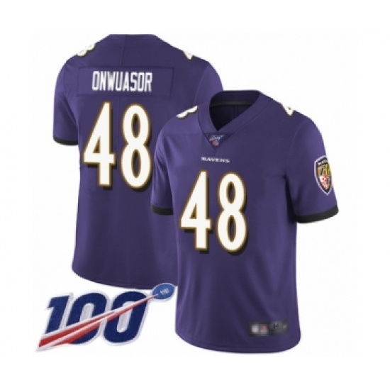 >Men's Baltimore Ravens #48 Patrick Onwuasor Purple Team Color Vapor Untouchable Limited Player 100th Season Football Jersey