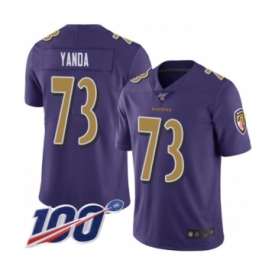 Men's Baltimore Ravens #73 Marshal Yanda Limited Purple Rush Vapor Untouchable 100th Season Football Jersey