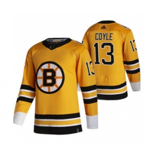 >Men's Boston Bruins #13 Charlie Coyle Yellow 2020-21 Reverse Retro Alternate Hockey Jersey