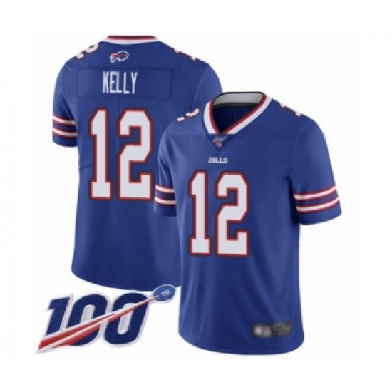 >Men's Buffalo Bills #12 Jim Kelly Royal Blue Team Color Vapor Untouchable Limited Player 100th Season Football Jersey
