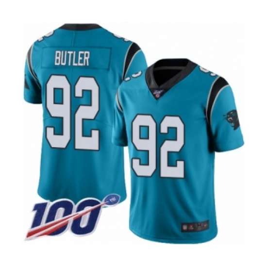 >Men's Carolina Panthers #92 Vernon Butler Limited Blue Rush Vapor Untouchable 100th Season Football Jersey