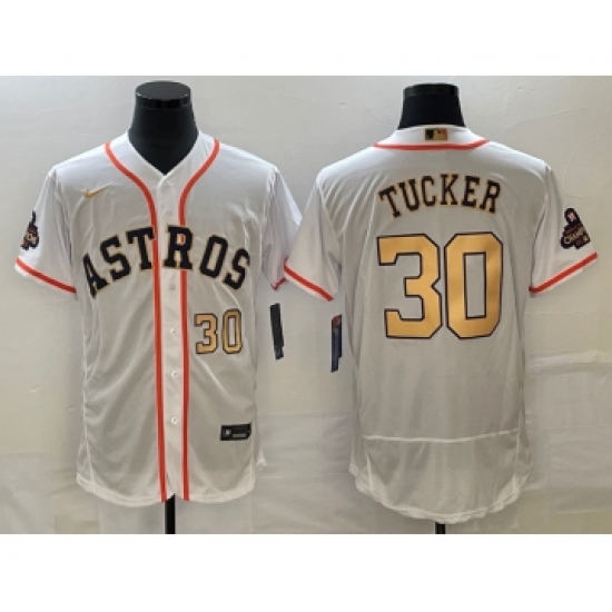 >Men's Houston Astros #30 Kyle Tucker Number 2023 White Gold World Serise Champions Flex Base Stitched Jersey1