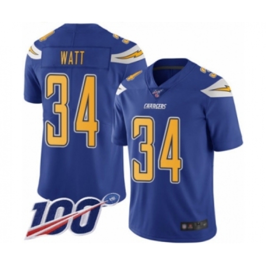 >Men's Los Angeles Chargers #34 Derek Watt Limited Electric Blue Rush Vapor Untouchable 100th Season Football Jersey