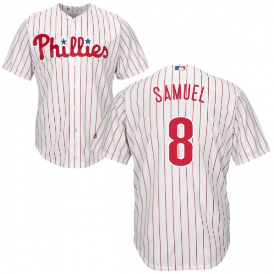 Home>MLB>Philadelphia Phillies>Juan Samuel>Men's Majestic Philadelphia Phillies #8 Juan Samuel Replica White/Red Strip Home Cool Base MLB Jersey