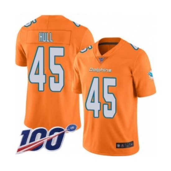 >Men's Miami Dolphins #45 Mike Hull Limited Orange Rush Vapor Untouchable 100th Season Football Jersey