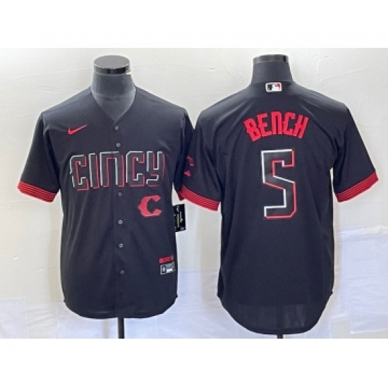 >Men's Nike Cincinnati Reds #5 Johnny Bench Black 2023 City Connect Cool Base Stitched Baseball Jersey1