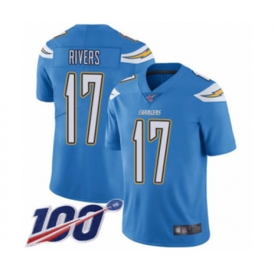 >Men's Nike Los Angeles Chargers #17 Philip Rivers Electric Blue Alternate Vapor Untouchable Limited Player 100th Season NFL Jersey