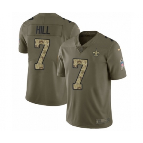 >Men's Nike New Orleans Saints #7 Taysom Hill Limited Olive Camo 2017 Salute to Service NFL Jersey