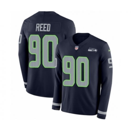>Men's Nike Seattle Seahawks #90 Jarran Reed Limited Navy Blue Therma Long Sleeve NFL Jersey