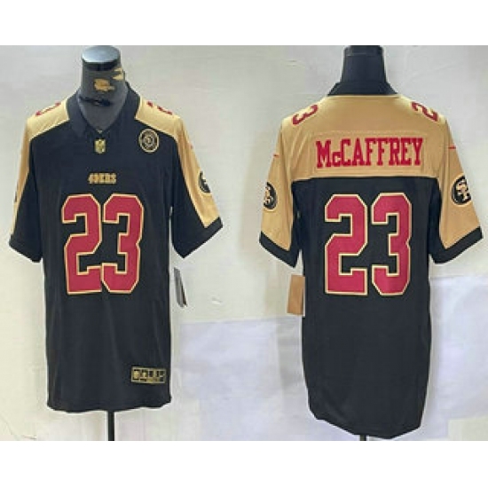 >Men's San Francisco 49ers #23 Christian McCaffrey Balck Golden FUSE Vapor Limited Stitched Jersey