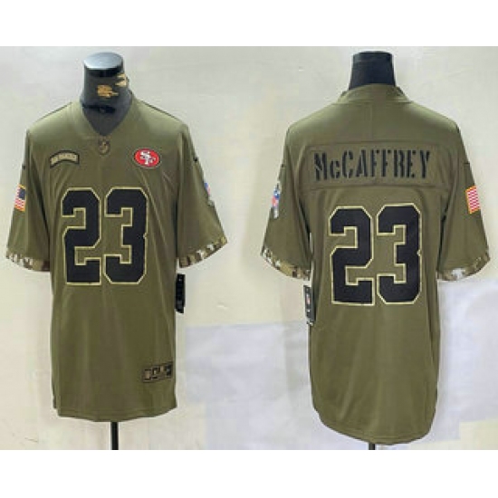 >Men's San Francisco 49ers #23 Christian McCaffrey Olive 2022 Salute To Service Limited Stitched Jersey