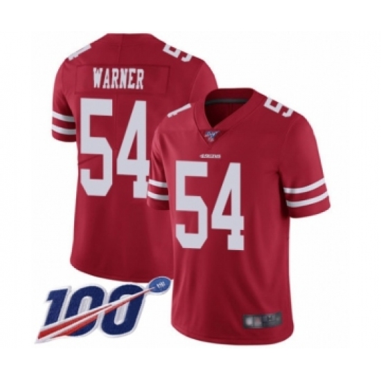 >Men's San Francisco 49ers #54 Fred Warner Red Team Color Vapor Untouchable Limited Player 100th Season Football Jersey