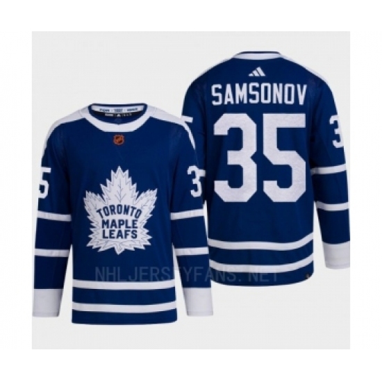 >Men's Toronto Maple Leafs #35 Ilya Samsonov Blue 2022 Reverse Retro Primegreen Jersey
