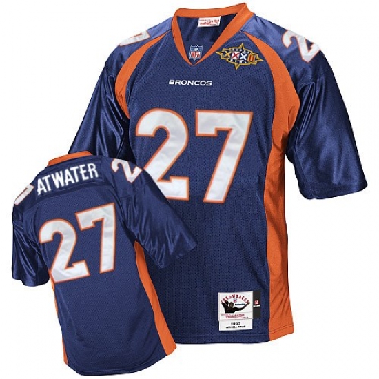 Feel like part of your favorite team by wearing this NFL® Mitchell And Ness Denver Broncos #27 Steve Atwater Navy Blue Super Bowl Patch Authentic Throwback NFL Jersey, made of thick, high-quality Pro-Brite fabric for a genuine gridiron look. The players number which 100% stitched is displayed in tackle twill on the chest, back and sleeves, along with the team name on the front. The players name which 100% stitched is displayed on a sewn-down nameplate at the back. 100% Pro-Brite nylon and 100% Pro-Brite polyester for body, 100% lycratalic spandex dazzle for Side Panels/Collar/Cuffs, NFL® Equipment patch sewn on the bottom of the front collar or fabric insert, NFL® Equipment jock tag with numeric sizing is applied to the lower left bottom of the jersey, Officially licensed.