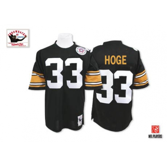 Feel like part of your favorite team by wearing this NFL® Mitchell and Ness Pittsburgh Steelers #33 Merril Hoge Black Authentic NFL Jersey, made of thick, high-quality Pro-Brite fabric for a genuine gridiron look. The players number which 100% stitched is displayed in tackle twill on the chest, back and sleeves, along with the team name on the front. The players name which 100% stitched is displayed on a sewn-down nameplate at the back. 100% Pro-Brite nylon and 100% Pro-Brite polyester for body, 100% lycratalic spandex dazzle for Side Panels/Collar/Cuffs, NFL® Equipment patch sewn on the bottom of the front collar or fabric insert, NFL® Equipment jock tag with numeric sizing is applied to the lower left bottom of the jersey, Officially licensed.
