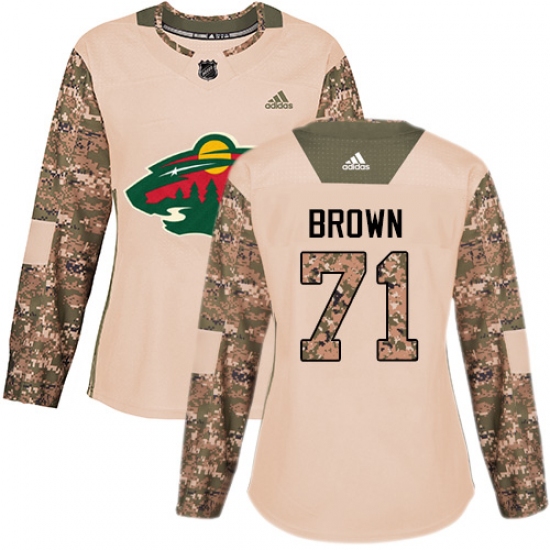 >Women's Adidas Minnesota Wild #71 J T Brown Authentic Camo Veterans Day Practice NHL Jersey