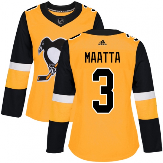 >Women's Adidas Pittsburgh Penguins #3 Olli Maatta Authentic Gold Alternate NHL Jersey