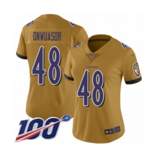 >Women's Baltimore Ravens #48 Patrick Onwuasor Limited Gold Inverted Legend 100th Season Football Jersey
