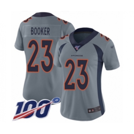 >Women's Denver Broncos #23 Devontae Booker Limited Silver Inverted Legend 100th Season Football Jersey