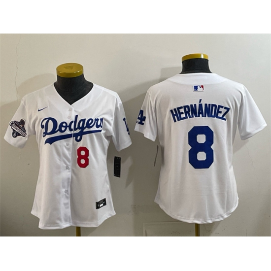 >Women's Los Angeles Dodgers #8 Enrique Hernández White 2025 World Series Champions Home Limited Stitched Baseball Jersey(Run Small)