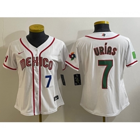 >Women's Mexico Baseball #7 Julio Urias Number 2023 White World Classic Stitched Jersey