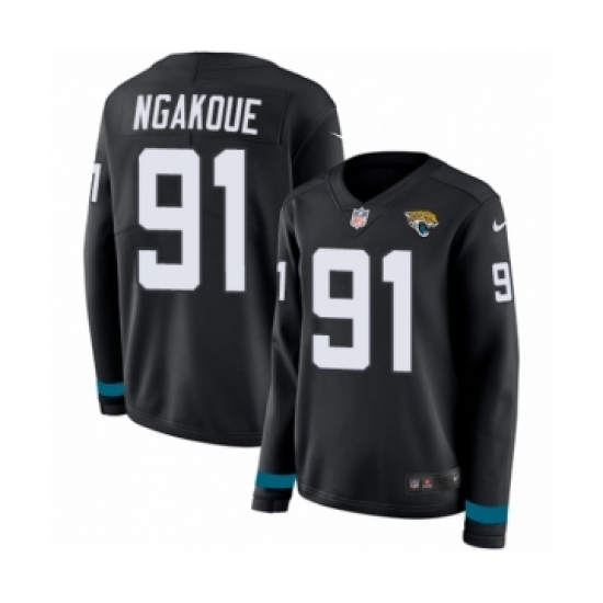 >Women's Nike Jacksonville Jaguars #91 Yannick Ngakoue Limited Black Therma Long Sleeve NFL Jersey