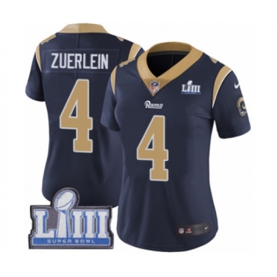 >Women's Nike Los Angeles Rams #4 Greg Zuerlein Navy Blue Team Color Vapor Untouchable Limited Player Super Bowl LIII Bound NFL Jersey