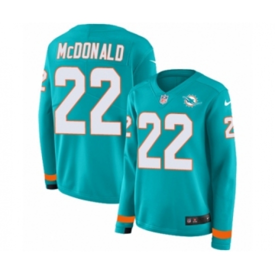 >Women's Nike Miami Dolphins #22 T.J. McDonald Limited Aqua Therma Long Sleeve NFL Jersey