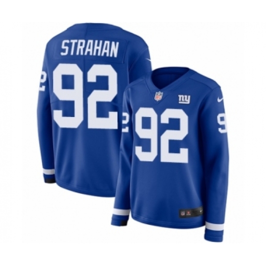 >Women's Nike New York Giants #92 Michael Strahan Limited Royal Blue Therma Long Sleeve NFL Jersey