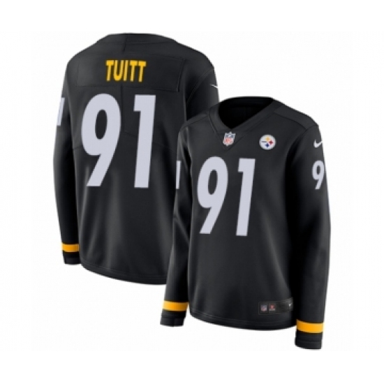 >Women's Nike Pittsburgh Steelers #91 Stephon Tuitt Limited Black Therma Long Sleeve NFL Jersey