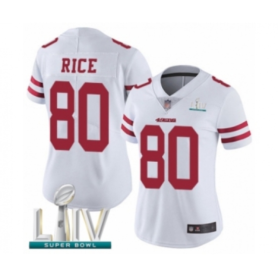 >Women's San Francisco 49ers #80 Jerry Rice White Vapor Untouchable Limited Player Super Bowl LIV Bound Football Jersey