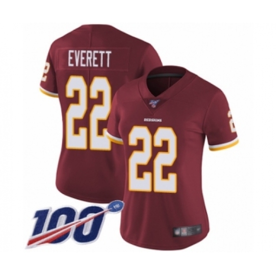 >Women's Washington Redskins #22 Deshazor Everett Burgundy Red Team Color Vapor Untouchable Limited Player 100th Season Football Jersey