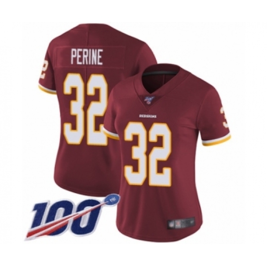 >Women's Washington Redskins #32 Samaje Perine Burgundy Red Team Color Vapor Untouchable Limited Player 100th Season Football Jersey