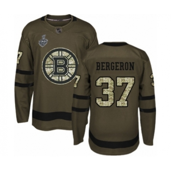 >Youth Boston Bruins #37 Patrice Bergeron Authentic Green Salute to Service 2019 Stanley Cup Final Bound Hockey Jersey