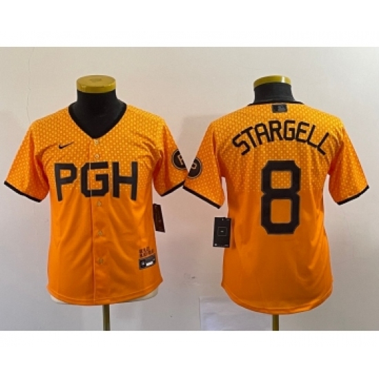 Youth Nike Pittsburgh Pirates #8 Willie Stargell Number Yellow 2023 City Connect Stitched Jersey4